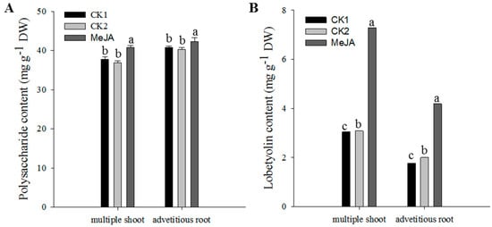 Effect of MeJA on the accumulation of polysaccharide (A) and lobetyolin (B) in multiple shoots using the adventitious root as the reference. CK1, blank control; CK2, solvent control. Statistically significant differences between the means were determined using Fisher’s LSD test p < 0.05) and indicated with different lowercase letters.
