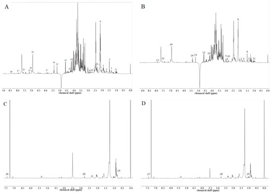 Spectra of 1H-NMR of the adventitious root treated with 100 µmol·L−1 MeJA at the 16th day of subculture. (A) Methanol aqueous phase of control. (B) Methanol aqueous phase of treatment. (C) Chloroform phase of control. (D) Chloroform phase of treatment. The compounds represented by numbers were listed in Table 1.