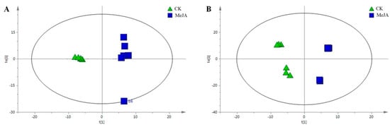Orthogonal partial least square-discriminant analysis (OPLS-DA) scores scatter plot showing the complete separation of the metabolite profiles of the adventitious root grown under normal (CK) and MeJA elicitation conditions. (A) Methanol aqueous phase. (B) Chloroform phase.