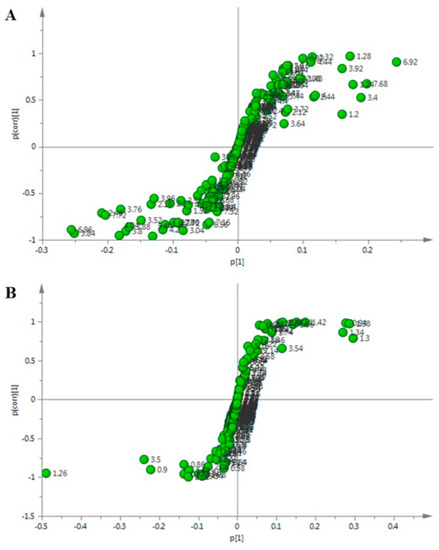 Finally, the S-plot analysis was performed to identify the putative biomarkers. The dots farther from the origin made a greater contribution to the differences between the groups, which could be considered as the potential biomarker (Figure 7).
