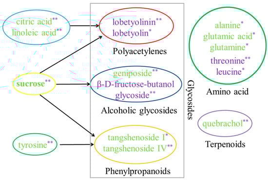 In total, eighteen compounds were identified and classified into or involved in the biosynthesis of amino acid, glycosides, sugar, and terpene, respectively (Figure 8). The t-test showed that the level of threonine and leucine significantly increased among the six amino acids, while the others (i.e., tyrosine, alanine, glutamic acid, and glutamine) decreased. Amongst the 18 biomarkers, the glycosides shared the larger part, including polyacetylene, alcoholic glycoside, and phenylpropanoids (Figure 8). Lobetyolinin and lobetyolin, the two polyacetylenes, exhibited a significantly increased level upon treatment with the MeJA, especially lobetyolinin. Meanwhile, the precursors of polyacetylene biosynthesis, i.e., citric acid and linoleic acid [39], exhibited extremely significant decreases in their levels. In addition, the level of β-d-fructose-butanol glycoside, an alcoholic glycoside, was most elevated after the MeJA treatment, accompanied by an extreme decrease in the level of sucrose. Moreover, another alcoholic glycoside, geniposide, exhibited a decreased change. Meanwhile, the MeJA led to a significant decrease of the two lignanoids, tangshenoside I and IV, while similar changes were found in the level of their potential precursors, tyrosine and sucrose. Compared with the control, the level of terpene and quebrachol, also decreased remarkably in the treatment with MeJA.