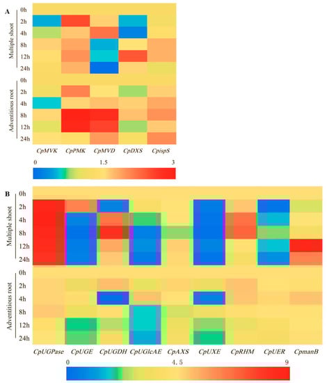 To gain insight into the molecular mechanism of the enhanced accumulation of bioactive compounds induced by MeJA elicitation, we analyzed the expression patterns of the genes associated with the biosynthesis of polysaccharide, glycosides, and atractylenolide III (belonging to terpenoid). Overall, the expression of CpPMK and CpispS genes, which participated in terpenoid synthesis, was up regulated after elicitation both in the multiple shoots and the adventitious roots. In contrast, the CpMVD gene in the multiple shoots showed down regulation, which was contrary to that in the adventitious roots after a 4 h MeJA treatment (Figure 9A). Remarkably, the expression of CpUGPase, which was involved in the carbohydrate synthesis, sharply increased after MeJA elicitation in the multiple shoots, whilst in the adventitious roots, it had no obvious changes. On the other hand, the CpUGE, CpUGDH, CpUGlcAE, CpUXE, CpUER genes were down regulated in both the shoots and the roots on the whole. However, CpmanB gene expression increased and reached the peak at the 12-h time point in the multiple shoots (Figure 9B).