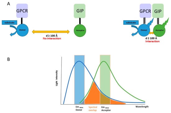 Bioluminescence Resonance Energy Transfer method. (A) BRET is suitable to detect the interaction of GPCR with GPCR-interacting proteins (GIP) in living cells when the distance between the two partners is <100 Å. (B) Basic properties of donor and acceptor molecules in order to gain BRET: the emission spectrum of the donor should overlap with the excitation spectrum of the acceptor.