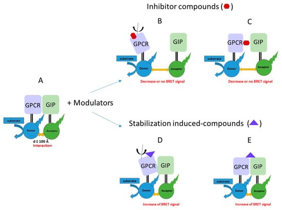 Modulators can induce PPI inhibition or stabilization. GPCR/GIP interaction can be detected by BRET (A). Modulators for GPCR/GIP interaction may function using orthosteric (binding at the protein-protein interface; (C,E) and allosteric (through conformational change of one protein in the complex; (B,D) mechanisms to lead to PPI inhibition or stabilization.