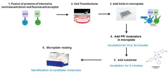 Most efforts on targeting GPCRs signaling remain focused on the identification of small molecules acting on orthosteric and allosteric sites at the extracellular surface of GPCRs. BRET-based assays are extensively used to study the effects of such ligands on GPCR/GIP interaction [101]. However, in the past few years, studies have also revealed that some small molecules can modulate receptor function by interacting with the intracellular side of GPCRs. It was shown that the interaction surface of these intracellular ligands overlap to some extend with binding sites of signaling molecules such as GαS and β arrestins [102]. Therefore, by precluding the interaction of the receptor with its interacting proteins, these intracellular ligands act as innovative PPI inhibitors.