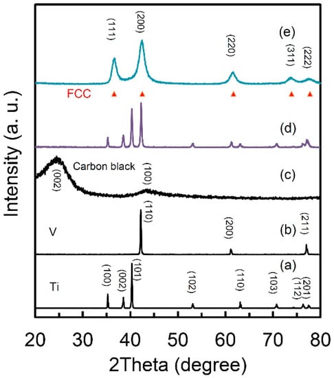 X-ray diffraction pattern of (a) Ti; (b) V; (c) carbon black; (d) mixture of Ti50V50+10 wt.% carbon black and (e) Ti50V50-10% C alloy with face-centered cubic (FCC) structure after 10 h mechanical alloying process.