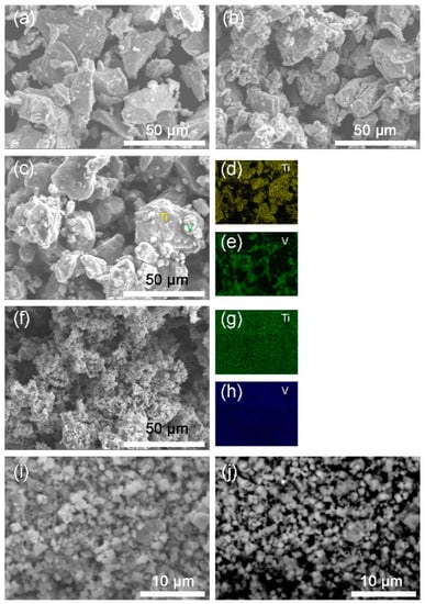 Secondary electron-scanning electron microscope (SE-SEM) images of (a) Ti; (b) V; (c) the mixture of Ti and V; (f,i) 10 h-milled Ti50V50-10% C alloy. (d,e,g,h) are energy dispersive X-ray spectrometer (EDS) mappings of Ti, V elements for images (c,f), respectively. (j) Backscattered electron-scanning electron microscope (BSE-SEM) image of the milled Ti50V50-10% C alloy.