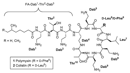 - Velkov, T.; Thompson, P.E.; Nation, R.L.; Li, J. Structure-Activity Relationships of Polymyxin Antibiotics. J. Med. Chem. 2010, 53, 1898–1916. [Google Scholar] [CrossRef] [PubMed]