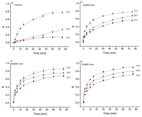 A previous study [2] showed a good linear correlation (R2 = 0.97) between the inulin (measured by HPLC) and the soluble matter content (°Brix) in the extracted juice from chicory roots. Here, we suppose that the total solutes’ extraction kinetics from Jerusalem artichokes corresponds roughly to the variation of the inulin content during the extraction experiment. The data presented in Figure 7 show that more rapid diffusion kinetics can be achieved at higher diffusion temperatures. The maximal value of B for the untreated sample was 0.78, corresponding to the diffusion temperature of 75 °C. However, the same value of B was achieved by freeze-thawing at 25 °C, indicating that the diffusion temperature might be reduced after pretreatments. Figure 7 b–d revealed that PEF treatment accelerated the solute diffusion, especially at low diffusion temperatures (25 °C). However, for the diffusion at 75 °C, the positive influence of PEF treatment was lower. These results revealed that the denaturation of plant tissue can be caused by both thermal and electrical treatment. To reach a satisfactory solute diffusion, an effective PEF pre-treatment can lead to less thermal treatment requirements, therefore, reducing the diffusion temperature.