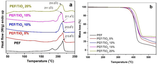 (a) DSC thermograms and (b) TGA thermograms of PEF and its nanocomposites with TiO2.