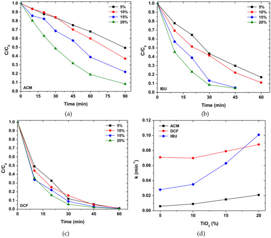 Effect of TiO2 amount immobilization at the efficiency of the anti-inflammatory drug mixture degradation under SSL, (a) ACM; (b) IBU; (c) DCF; (d) variation of degradation kinetic rate (k) versus TiO2 % content, (Co(drug) = 5 mg L−1); and (C(catalyst) = 600 mg L−1).