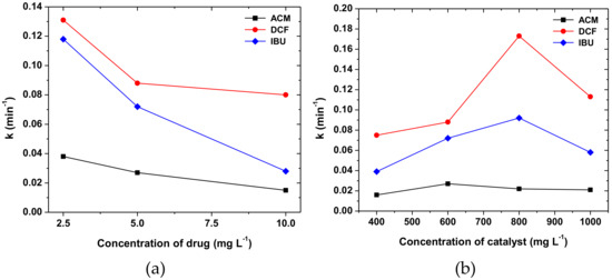 Additionally, experiments were conducted in order to investigate the effect of the initial concentration of the mixture (2.5–10 mg L−1 of each compound), keeping the rest of the parameters constant. According to the results (Figure 6a), an increase in the concentration of the mixture leads to a decrease in the photocatalytic rate constants that could be attributed to the lower ratio of active oxidative species to the substrate molecules, which has also been reported elsewhere [48,49,50]. The concentration of 5 mg L−1 for each drug was selected for further experiments and the effect of several parameters to pollutants removal was evaluated, since this concentration enables the proper monitoring of the degradation kinetics. The degradation curves obtained for each drug are given in detail in the Supplementary Materials (Figure S1).