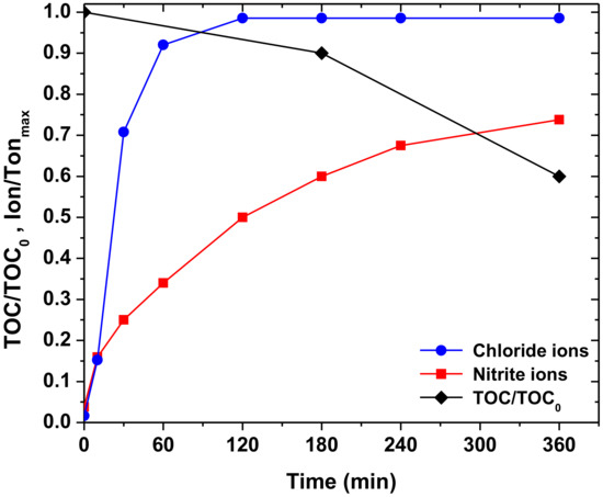 In order to assess the efficiency of PEF/TiO2 20% for the degradation of the anti-inflammatory drug mixture, mineralization studies were conducted. The concentration of each drug was 5 mg L−1, while the concentration of the catalyst was 600 mg L−1. The mineralization was studied for 360 min of irradiation (Figure 7). Although, all compounds degrade quite fast (during the first 90 min of treatment), TOC removal follows a slow rate reaching approximately 50% decrease after 360 min, demonstrating that the photocatalytic treatment needs prolonged irradiation times for leading to complete mineralization. This is probably due to the transformation products formed from the degradation of parent compounds. The chloride ions released from the degradation of DCF, reaches almost 100% from the first 120 min of treatment, probably indicating that the transformation products released are chloride-free or that the transformation products of DCF also degrade quickly. Nitrite ions were also released during the photocatalytic treatment, from the degradation of DCF and ACM. Their release reached approximately 70% at the 240 min of irradiation, while no nitrate ions are observed.