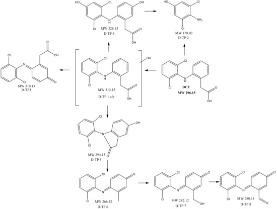 - Calza, P.; Sakkas, V.A.; Medana, C.; Baiocchi, C.; Dimou, A.; Pelizzetti, E.; Albanis, T. Photocatalytic degradation study of diclofenac over aqueous TiO2 suspensions. Appl. Catal. B Environ. 2006, 67, 197–205. [Google Scholar] [CrossRef]