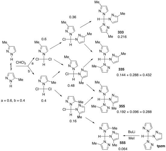 The reaction was reported again in 1999 and, surprisingly, the only isolated isomer (17% yield) was the 335 isomer (1H, CDCl3, Csp3-H: 8.21 ppm) [7]. In 2012 the more hindered 555 derivative was prepared from tri(pyrazol-1-yl)methane (tpzm) by alkylation of the lithium derivative (1H, CDCl3, Csp3-H: 8.31 ppm) [8].