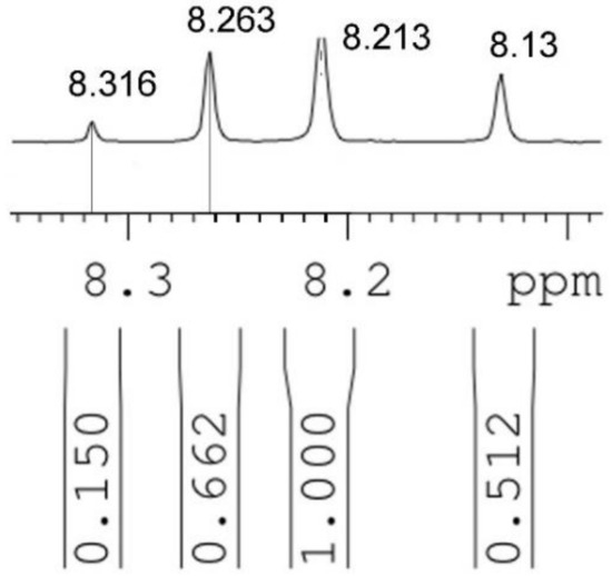 The authors point out that the 333 isomer, δ = 8.13 ppm, represents approximately 22% of the crude. From the data of Figure 2 reported and from the integration (total 2.324) it is easy to determine the proportions: 333, δ = 8.13 ppm, 22%; 335, δ = 8.21 ppm, 43%; 355, δ = 8.26 ppm, 28.5%; and 555, δ = 8.32 ppm, 6.5%.
