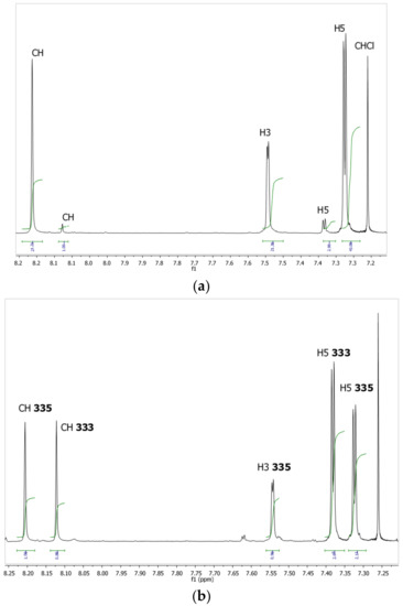 Evolution of the 333/335 ratio with time. (a) Recorded after 1 h in CDCl3, about 95% of 335 isomer and 5% of 333 isomer; (b) recorded after one night in CDCl3, about 50/50 of 335 and 333 isomer.