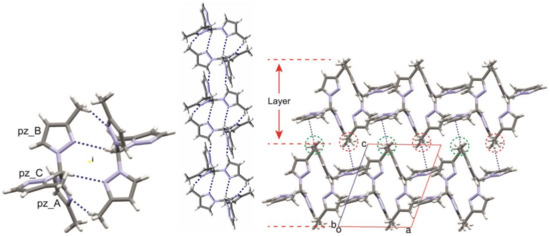 Compound 335 forms dimers through weak CH···N hydrogen bonds (C1-H···N2(B), C6(B)-H···N2(A)) that expand into chains along (1–10) axis by C5(B)-H···N2(C) contacts. Saturating the three N-acceptors in the molecules, these chains join to form (001) layers by C-H···π-pz non-bonded interactions (C3(C)-H···π-pz(A), C4(C)-H···π-pz(B)). Methyl groups of pyrazoles A and B point out of these layers forming lines along the b-direction with an a-axis separation between methyl lines where a methyl line, from a consecutive layer, fits as a zipper to pack the layers and to build the crystal. C6(A)-H···π-pz(C) and van der Waal interactions glue the layers (Figure 6).