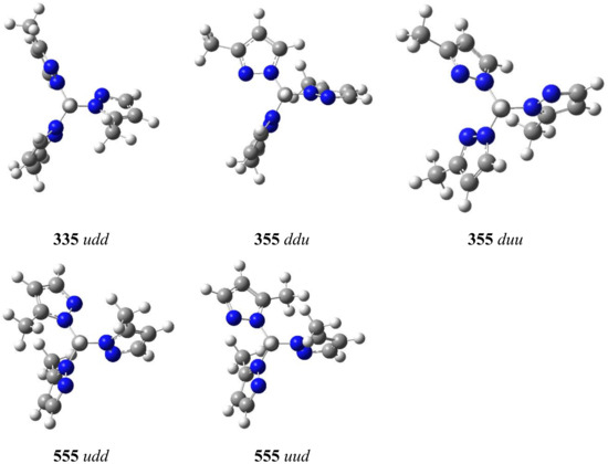 The isomers’ stability decreases in the order 333 (0.0) > 335 (1.7) > 355 (17.9) > 555 (23.8 kJ·mol−1), in agreement with the experimental results; this is the thermodynamic order that is unrelated to the kinetic order of the percentages measured on the crude. The acid-catalyzed isomerization from the crude leads to a mixture of 333 and 335 which have very close energies (Figure 7) [8]. Concerning the up/down isomerism, the most stable are the uud ones (333, 335), the ddu one (355) and the udd one (555). The 355 uud is 9.9 kJ·mol−1 above the 355 ddu and the 555 uud is 5.9 kJ·mol−1 above the 555 udd one.