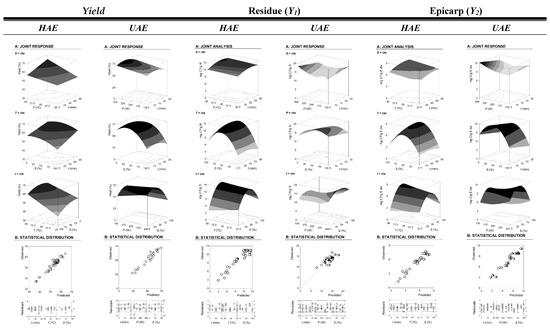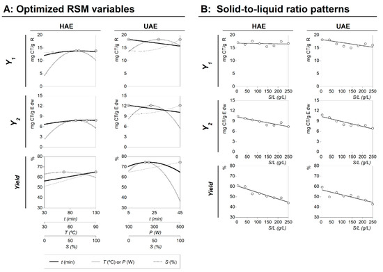 - For the HAE technique: In global terms, the significant parametric values within the linear effect (LE) group have a far more relevant contribution to the description of the responses than the interactive effect (IE), with the quadratic effect (QE) group being the less representative one (LE > IE >> QE). In the extraction Yield response, the three variables assessed (t, T, and S) showed similar contributions to its description. Regarding the response values of Y1 (mg CT/g R) and Y2 (mg CT/g E dw), the contribution of the variables is S >> T > t.