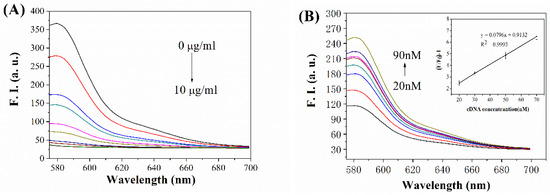 Firstly, the quench efficiency of GO binding ssDNA was detected, as shown in Figure 2A. The fluorescence intensity of TAMRA-labeled T-DNA (6 μL, 20 nM) changes with the different concentrations of GO (0, 2, 3, 4, 5, 6, 7, 8, 9, and 10 μg/mL). It was shown that the fluorescent intensity of T-DNA was gradually decreased with the increasing GO concentration. When the concentration of GO is 9 μg/mL, the fluorescent intensity of DNA is quenched approximately 91.6%. While the concentration of GO is below 9 μg/mL, the fluorescent intensity of DNA cannot be quenched enough to achieve the purpose of detection. When the concentration of GO is higher than 9 μg/mL, excessive GO causes more fluorescent DNA to bind on the surface of GO, which would weaken the sensitivity of further detection. Thus, the concentration of GO in the following work is fixed at 9 μg/mL.