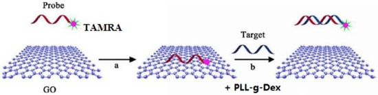 As a water-soluble derivative of graphene, graphene oxide (GO) has great potential in biosensors and biological analysis. [8,9,10,11,12,13,14,15]. Compared with other nanomaterials, GO is low cost, with low fluorescence background owing to the high FRET efficiency between the GO and the fluorophores, and a high signal-to-noise ratio. More especially, it is well known that GO can effectively quench the fluorescence of organic dyes through long-range nanometer energy transfer. In addition, it is reported that GO strongly interacts with ssDNA nucleotides through the π-stacking between the ring structure of the nucleobase and the hexagonal cells of GO, while dsDNA cannot be adsorbed stably on the GO surface because it effectively shields the nucleotides in negatively charged dsDNA phosphoric acid backbone [16]. Therefore, GO can interact with ssDNA noncovalently by π-π stacking interactions between nucleotide bases and GO, but hardly interact with rigid dsDNA or aptamer-target complexes. Moreover, GO can protect DNA against enzymatic cleavage compared with free DNA probes. Based on these properties of GO mentioned above, a series of convenient and universal strategies were explored for highly sensitive, highly selective, and low-cost detection of DNA [8,14,15], metal ions [17], small molecules [9], protein [18], the screening of aptamers [19], and even in situ cellular imaging [20,21]. However, the target DNA-sequence signal specificity is very low, thus the rate of formation and release of dsDNA from GO is very slow, and the single base mismatch target cannot be distinguished, which prevents the limitation of detection from being further improved. Recently, DNA chips and microarrays using water-soluble cationic conjugated polymers were reported to increase the sensitivity of fluorescent DNA biosensors [22,23,24].