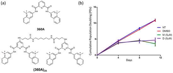 Chemical structure of 360A and (360A)2A and the effect of these ligands on the proliferation of A549 cells: (a) Chemical structure of G4 ligands 360A and (360A)2A; (b) Cell growth curves plotting mean PDs and days in culture of non-treated A549 (NT), A549 treated with 0.1% DMSO (DMSO), with 5 μM of 360A (M), or with 5 μM of (360A)2A (D) (n = 3 independent experiments; error bars, SD).