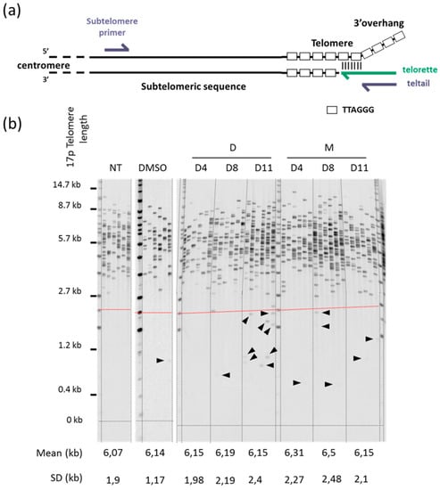 Next, we used the genomic DNA extracted from samples obtained at each reseeding of the cell growth experiments to examine the effect of 360A and (360A)2A on 17p (i.e., the short arm of chromosome 17) telomere length using STELA [5]. A prerequisite to STELA is the identification of a chromosome-specific telomere-adjacent DNA sequence. As the subtelomere sequence of human 17p is well characterized, STELA at 17p telomere is robust and has been extensively used [6,7,8]. STELA is a PCR-based approach that relies on the use of a set of primers comprising: (i) a linker primer, called “telorette”, constituted by seven bases complementary to the G-rich 3′ overhang followed by a unique 20-nucleotide tail non complementary to the telomere; (ii) a subtelomere specific primer close to the beginning of the telomere and specific to a chromosome end; and (iii) a primer called “teltail”, whose sequence is identical to the telorette 20-nucleotide tail (Figure 2a). Each extracted DNA sample is analyzed with typically six PCR reactions that contain between four and 30 amplifiable molecules. PCR products are then resolved on an agarose gel and detected by southern blot hybridization with a radiolabeled telomere probe. Each band detected on the membrane represents a single telomere. Thus, STELA gives the full spectrum of telomere lengths of a specific chromosome end and can detect rare short telomeres (TDEs), distinct from the bulk population, which cannot be visualized by any other methods. We performed STELA to measure 17p telomere length at each reseeding point (i.e., at day 4, 8, and 11), during the course of the cell growth experiments, in control and treated cells. Overall, we did not observe any significant difference in the mean telomere length of cells treated with 360A and (360A)2A compared with control cells (non-treated or 0.1% DMSO) as a function of PDs (Figure 2b). These data are consistent with previous observations in other cancer cell lines showing that the antiproliferative effect of 2,6-pyrimide-dicarboxamide derivatives was not associated with progressive telomere shortening with ongoing cell divisions [19,21].