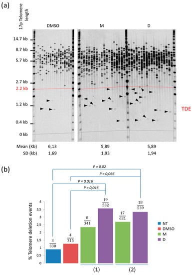 Telomeres are nucleoprotein structures that cap and protect the natural ends of chromosomes by preventing them from being recognized as DNA double strand breaks [1]. In human cells, telomeric DNA is composed of the TTAGGG sequence tandemly repeated to a size up to 25 kb. Their functions rely on a complex of telomere-associated-proteins named “shelterin” [2]. In most somatic cells, telomeres erode at each cell division due to the so-called “end-replication problem” [3,4]. But they can also shorten as a consequence of stochastic deletion events, resulting in telomeres extremely shorter than the bulk population, often called TDEs (for telomere deletion events) [5,6,7,8]. The underlying mechanisms that result in these TDEs are still unclear. Telomere erosion ultimately results in a partial loss of telomere function, triggering a stable cell cycle arrest termed replicative senescence. In the absence of fully functional DNA damage checkpoints, telomeres can shorten to a length at which they become dysfunctional and capable of fusion with other telomeres or with non-telomeric loci, which may contribute to the acquisition of large-scale genomic rearrangements and cancer progression.