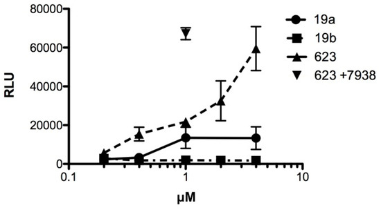 Oligonucleotides conjugated to Retro-1 derivatives were examined for splice correction activity. The experiments utilized the HeLa Luc 705 cell line [19], as described in Materials and Methods. Oligonucleotides having the known splice correcting sequence r5’GTTATTCTTTAGAATGGTGC3’, previously termed SSO623 [19], were used in conjugated or unconjugated form and were compared to control oligonucleotides with the inactive sequence r5’TGTGTACTGATGTAGTTATC3’. In Figure 1 oligonucleotide 19a, which is the immediate conjugate of Retro-1, was compared to its control conjugate 19b. Furthermore, we examined unmodified SSO623, as well as SSO623 followed by treatment with the small molecule UNC7938 as a positive control. As seen in the figure, oligonucleotide 19a produced a dose-dependent luciferase induction while the control oligonucleotide 19b did not. However, SSO623 itself also gave rise to a progressive induction of luciferase that was somewhat greater than that produced by 19a. The dual use of SSO623 and UNC7938 provided the largest degree of splice correction and luciferase induction as expected. This set of experiments demonstrated that coupling of the Retro moiety did not prevent the splice correcting activity of the active oligonucleotide. However, conjugate 19a did not provide an advantage, in terms of potency or efficacy, over SSO623 itself. We also examined two additional conjugates 22a and 23a. However, neither of these conjugates displayed an advantage over SSO623 in the HeLa Luc 705 induction assay.
