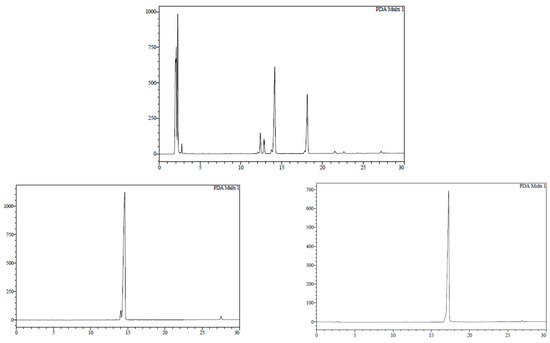 Analytical HPLC traces of crude 16 (top), purified diastereomer 1 (bottom, left) and purified diastereomer 2 (bottom, right). Detection wavelength: 250 nm. Top trace, tR ~ 2–3 min: 15 & N,N’-diisopropylurea.
