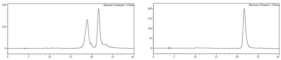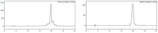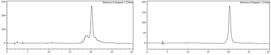 HPLC trace of crude (left) and purified (right) conjugate 19a. Detection wavelength: 254 nm.