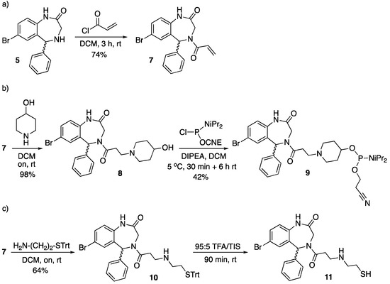 Synthesis of the Retro-1 analogs modified at position 4 of the benzodiazepine ring. The first step (a) afforded the common precursor, which was subsequently modified to obtain either phosphoramidite derivative 9 (b) or the thiol-modified compound 11 (c). CNE = 2-cyanoethyl; DCM = dichloromethane; DIPEA = N,N-diisopropylethylamine; rt = room temperature; TEA = triethylamine; TFA = trifluoroacetic acid; TIS = triisopropylsilane; Trt = trityl. The wavy bond indicates a not defined stereochemistry.