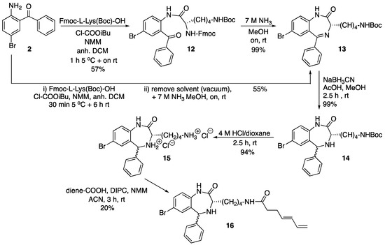 7-Bromo-1,3,4,5-tetrahydro-4-{4-[N-[(4E)-4,6-heptadienoyl]-amino]butyl}-5-phenyl-2H-1,4-benzodiazepin-2-one (16). N,N’-Diisopropylcarbodiimide (61 µL, 0.39 mmol) and N-methylmorpholine (2.6 µL, 0.03 mmol) were added to a solution of (4E)-4,6-heptadienoic acid (49 mg, 0.39 mmol) in HPLC-quality acetonitrile (1 mL), and the mixture was left stirring for 10 min. Afterwards, 15 (50 mg, 0.13 mmol) and an additional amount of N-methylmorpholine (2.6 µL, 0.03 mmol) were poured onto the mixture. Additional amounts of N-methylmorpholine (2.6 µL, 0.03 mmol) were added after 20 and 40 min, respectively, and the solution was stirred for up to 2 h at room temperature. Subsequently, acetonitrile was added (4 mL), and the crude was filtered using a hydrophilic PTFE syringe filter (0.22 µm), purified by RP-HPLC (Jupiter Proteo C18 (10 μm, 250 nm, 250 × 10 mm) from Phenomenex, solvent A: H2O 0.1% formic acid; solvent B: ACN 0.1% formic acid, linear gradient 40 → 80% B, 3 mL/min, detection wavelength 254 nm) and lyophilized. The title compound (16) was obtained as a white solid (10.7 mg, 20%).
