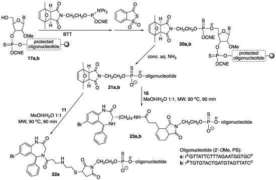 For the preparation of the other conjugates (Scheme 5), the 2,5-dimethylfuran-protected maleimide phosphoramidite was coupled to either oligonucleotide-resin 17 (2 × 10 min coupling, activation with BTT), and the resulting phosphite triester sulfurized (Beaucage reagent). Treatment of oligonucleotide-reins 20 with conc. aq. ammonia afforded [protected maleimido]-oligonucleotides 21, which were purified. Conjugates 22 and 23 were obtained by simultaneously carrying out maleimide deprotection (retro Diels-Alder reaction) and reaction with either the thiol-containing derivative 11 (Michael-type reaction) or the diene-derivatized compound 16 (Diels-Alder cycloaddition) in a microwave (MW) oven.