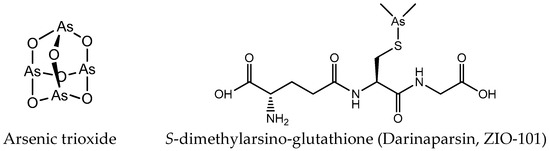 Except platinum and ruthenium, arsenic and gold complexes are also used as anticancer agents. AsIII and AsV are the main oxidation states of arsenic. The cytotoxic activity of arsenic compounds in the trivalent state is strongly associated with the enhanced production of reactive oxygen species (ROS) [27,28]. The biological activity of pentavalent arsenic is mainly based on substitution for phosphate (e.g., in ATP) [29]. Amongst the various forms of arsenicals, the greatest clinical success has been the one of arsenic trioxide (ATO; As2O3, Trisenox®) (Figure 3) in the treatment of hematological cancers, especially acute promyelocytic leukemia (APL) [30,31]. Arsenic trioxide forms inorganic As(OH)3 in an aqueous environment, and this form can be transported intracellularly via aquaglyceroporin channels due to its similarity to glycerol [32]. In addition to arsenic trioxide, other organic and inorganic arsenic agents are undergoing clinical trials for hematological malignancies, such as S-dimethylarsino-glutathione (Figure 3) [33].