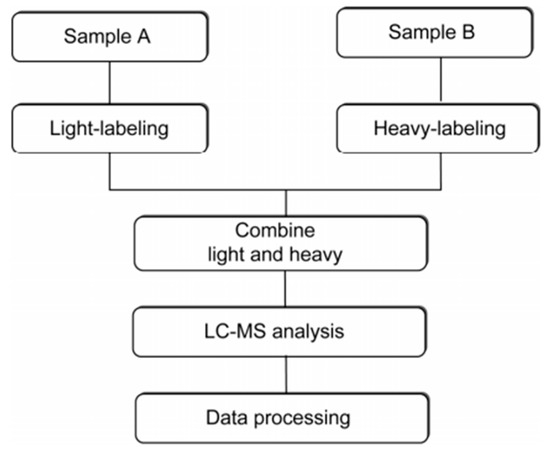 Current methods for protein quantitation can be classified into two main categories: stable isotope labeling and label-free quantitation. Stable isotope labeling can introduce isotopically labeled forms into target components for relative quantification. The light labeled and heavy labeled proteins are mixed proportionally before LC/MS analysis, and the peak area ratio of ion pairs generated by isotopically labeled analytes is used to quantify the components in the sample [42]. The workflow is shown in Figure 5. ICAT, TMT, iTRAQ, and SILAC belong to this category, and they are commonly used in quantitative proteomics research. A comparison of those methods is shown in Table 1.