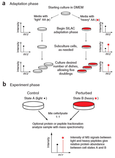 Overview of stable isotope labeling by amino acids in cell culture (SILAC) protocol. The SILAC experiment consists of two distinct phases: an adaptation (a) and an experimental (b) phase. This figure is adapted from reference [64].