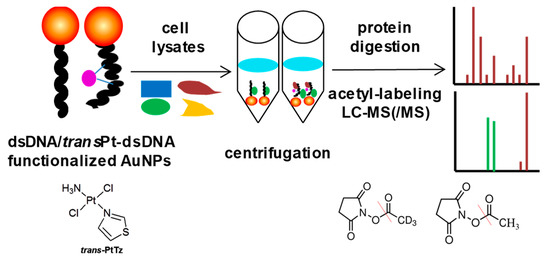 The characteristics of high anticancer efficiency of cisplatin and the clinical inactivity of its trans isomer (transplatin) have been considered a paradigm for the classical structure-activity relationships of platinum drugs. However, some new analogues of transplatin exhibit activity in cisplatin-resistant tumor cells, but the mechanism behind this activity is unknown. An MS-based proteomic strategy combined with functionalized gold nanoparticles as affinity probes was developed to study the cellular proteins responding to damaged DNA by cisplatin and trans-PtTz (Figure 10) [72]. To exclude nonspecific binding proteins to the platinated DNA, the negative probe with native double-stranded DNA on gold nanoparticles was utilized as a control. As a result, the well-known protein HMGB1 was identified as a binding partner of platinated DNA by cisplatin, and the nuclear protein positive cofactor PC4 was found to bind specifically with cross-linked DNA by trans-PtTz, which will shed light on the mechanism of this active transplatinum complex.