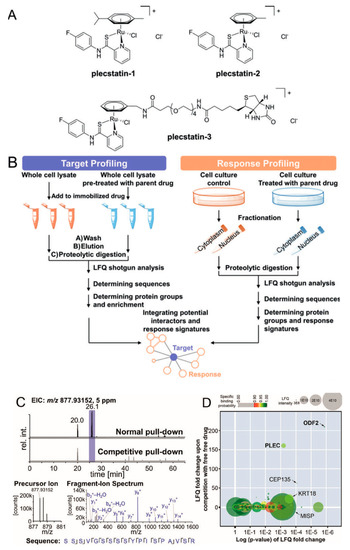 Potential protein targets of ruthenium(arene) pyridinecarbothioamides (plecstatins) were obtained by integrated target-response profiling. (A) Chemical structures. (B) Schematic representation of the integrated target-response profiling workflow. (C) Selected chromatograms and mass spectra of a plectin-specific tryptic peptide. (D) Plot of the target profiling experiment. PLEC: plectin; ODF2: outer dense fiber protein 2. This figure is adapted from reference [49].