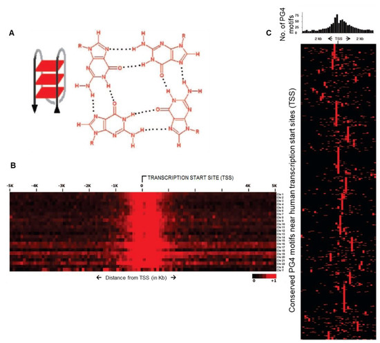 The G4 structure and its relevance. (A) G-quadruplex (G4) structural illustration: left panel with G-tetrad planes forming an intramolecular G4 stem, right panel shows Hoogsteen base-pairing of guanines making a G-tetrad. (B) Heat map showing averaged relative enrichment of potential G4 (PG4) sequences near TSS across all chromosomes in the human genome (density of PG4s in 100 base windows). (C) Heat map of conserved promoter PG4s across organisms: upper panel shows enriched PG4 motifs near TSS, lower panel shows conservation of PG4 motif clusters between human and ‘orthologous’ mouse and rat promoters (red boxes for PG4 motifs per 100 bp window, each row displays individual promoters); 773 human promoters containing 1414 PG4 motifs shown here. Reprinted (adapted) with permission from (Verma, A. et al. Genome-Wide Computational and Expression Analyses Reveal G-Quadruplex DNA Motifs as Conserved cis-Regulatory Elements in Human and Related Species. J. Med. Chem. 51, 5641–5649 (2008)). Copyright (2008) American Chemical Society.