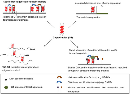 - Mukherjee, A.K.; Sharma, S.; Chowdhury, S. Non-duplex G-Quadruplex Structures Emerge as Mediators of Epigenetic Modifications. Trends Genet. 2019, 35, 129–144. [Google Scholar] [CrossRef]