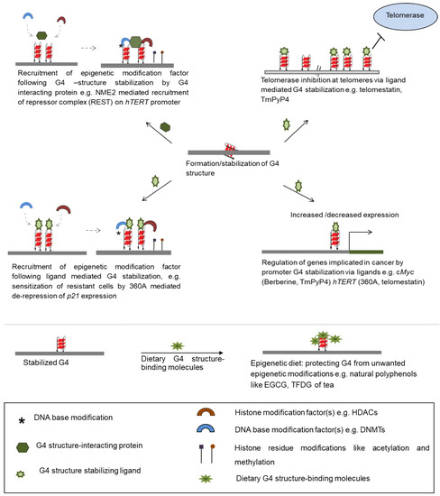Ways of therapeutic intervention through G4 structure-binding small molecules. Stabilization of G4 structure by means of ligands inhibits telomerase activity at telomeres, regulates expression of genes at transcriptional and epigenetic levels. Proteins stabilizing G4 structure upon binding, allow epigenetic modifiers to dock at the site, further regulating gene expression. Several dietary components protect G4 structure from unwanted modifications by binding to the secondary structure. HDACs: histone deacetlyases; DNMTs: DNA methyltransferases.
