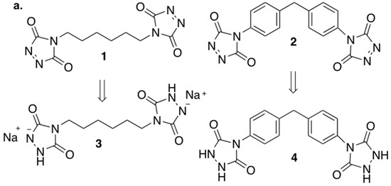 Cross-linkers 1 and 2 were synthesized adapting literature procedures reported by Culbertson and McGrath [54]. The procedure by Mallakpour and co-worker was used for the oxidation of urazoles 3 and 4 [55]. For sake of completeness synthetic procedures are reported in the Supplementary Material.