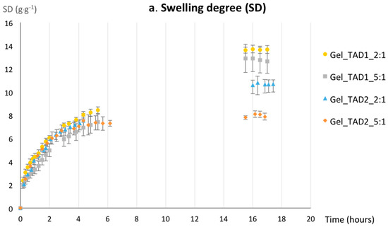 The SD plot (Figure 4a) shows a similar kinetic behavior for all of the considered specimen within the first 5 h. However, Gel_TAD1 samples have better water retaining properties if compared to Gel_TAD2, requiring higher times for reaching the equilibrium. This behavior might be ascribed to the different hydrophilicity of the linkers and eventually to the different conformational freedom that may have a role in the chain mobility of the network. The diphenyl moiety in TAD 2 is more hydrophobic and confers higher conformational rigidity to the cross-linker if compared to the hexyl moiety in TAD 1. In addition, the chemical nature of TAD 2 has more relevance in influencing gel properties as a function of TAD/Tyr ratio: the higher the TAD/Tyr ratio, the lower SD and EWC values.