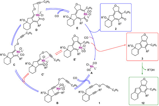 Scheme 3 summarizes the proposed mechanism for carbonylative cycloaddition, cyclotrimerization and cyclotrimerization/elimination processes based on previous studies [17,30]. It is unsure if the dimeric pre-catalyst first undergoes ligand exchange with CO to form catalytic species [RhCl(CO)3] or if the coordination bond with the bridging chloride is preserved. L’ in A can therefore be another CO ligand or the second half of the dimeric catalyst. The two alkyne moieties of substrate 1, ideally placed by the cyclic core, then coordinate to the metallic center, displacing the CO ligands and forming intermediate B. This 18-electron complex can undergo a [2+2+M] cyclometallation, yielding either a 16-electron complex C or an 18-electron complex C′, which is stabilized by the chelation of the third alkyne moiety. Migratory insertion of CO can take place in the Rh-Csp2 bond of intermediate C to access intermediate D, where the electron-deficient complex is stabilized by the chelation of the third alkyne. This triple bond undergoes migratory insertion, forming 8-membered rhodacycle E, which, after reductive elimination, releases troponic compound 2 and catalytic species A. Complex C′, being already chelated by the third alkyne moiety, can undergo direct migratory insertion of the multiple bond, yielding 7-membered rhodacycle E′. DFT calculations on the [2+2+2+1] carbonylative cycloaddition of enediynes have shown that late stage CO insertion is highly disfavored, thus E′ undergoes direct reductive elimination to release benzenoid compound 3 in the media [31,32].