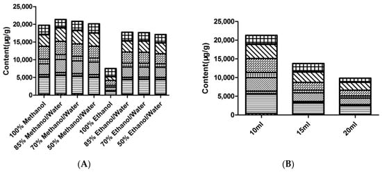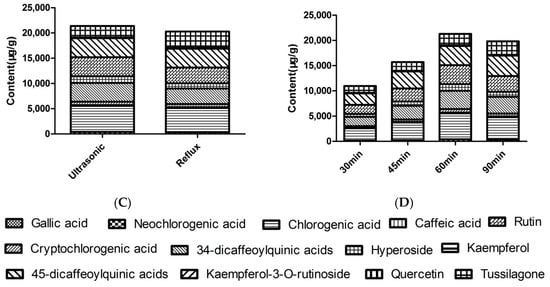 (A): Extraction efficiency of different solvents combinations; (B): Extraction efficiency of different solvent volumes; (C): Extraction efficiency of different extraction methods; (D): Extraction efficiency of different extraction times.