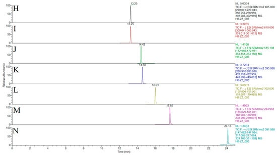 Chromatogram of the 13 the quality markers of traditional Chinese medicines (TCMs; all together: Q-markers) and internal standard (sequence numbers A–N are GA, 5-CQA, 3-CQA, CA, 4-CQA, chloramphenicol, 3,4-diCQA, hyperoside, rutin, 4,5-diCQA, kaempferol-3-O-rutinoside, quercetin, kaempferol, and tussilagone, respectively).