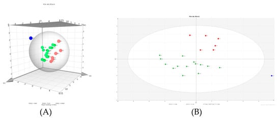Principal component analysis (PCA) is a multivariate mathematical statistical method that reduces dimensionality or converts multiple indicators into a few comprehensive indicators. It mainly eliminates the overlap and correlation in the chemical information through the dimensionality reduction of the data, and the multidimensional index becomes a simple index under the premise of losing little information, so that the data are simpler, more intuitive, and clearer []. PCA is widely used to evaluate the differences between the quality of Chinese herbal medicines and processed products []. The content of raw and processed FF was calculated in three dimensions. In Figure 3A,B, it can be seen that the 21 batches of samples were divided into two groups, with the green dots representing raw products and the red dots representing processed products. This directly reflects the significant differences between the raw and processed FF. S8 deviated from all the groups. There are several possible explanations for this result: one is that because we only studied 21 batches of FF samples and did not analyze all the origins of FF, the experimental results were accidental and uncertain. Another possible reason is that the FF samples we obtained may have been harvested in different seasons, which may have caused a significant difference in the content of the active components of the FF.