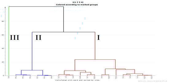 Dendrogram of the hierarchical cluster analysis (HCA) for the 21 batches of raw (S1–S15; group I) and processed (P1–P6; group II) FF. Group III included only S8.